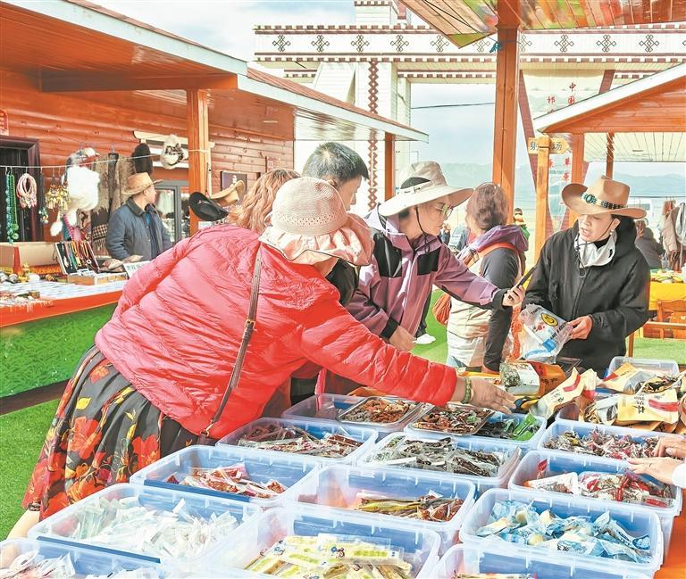 在祁華錦秀峨堡古城驛站內(nèi)游客在挑選牦牛肉干。丁玉梅 攝