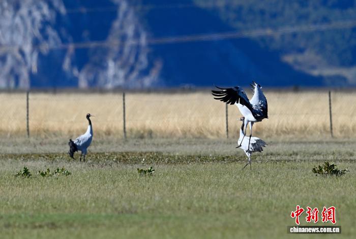 10月15日,3只黑頸鶴在納帕海嬉戲。陳志明 攝