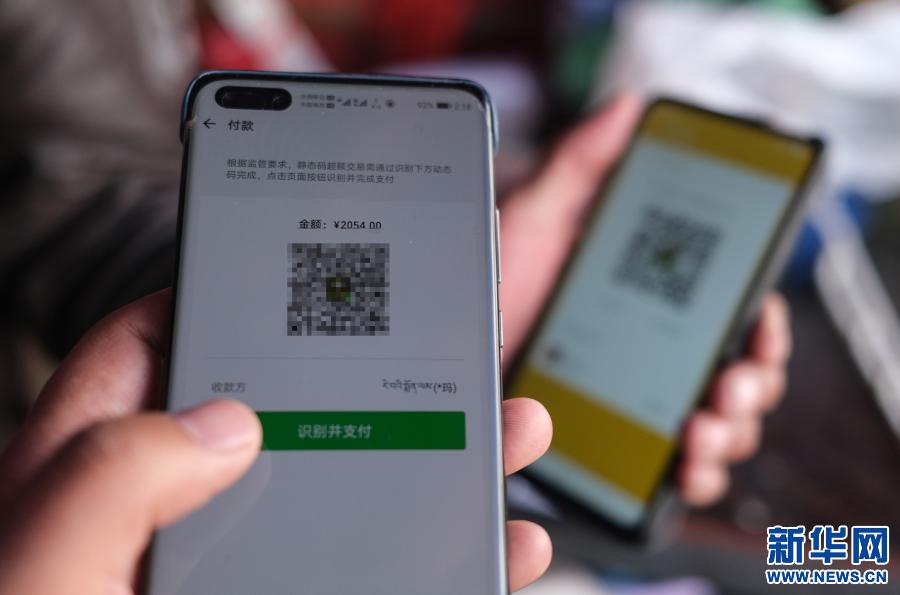 顧客用微信支付剛買(mǎi)的牛羊肉款(2020年12月31日攝)。新華社記者 晉美多吉 攝