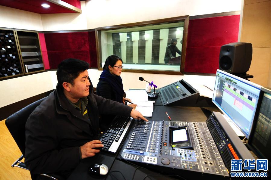 在中國西藏廣播電影電視藏語節(jié)目譯制中心,工作人員正在為影片《催眠大師》進(jìn)行藏語配音(2015年12月11日攝)。新華社記者晉美多吉 攝