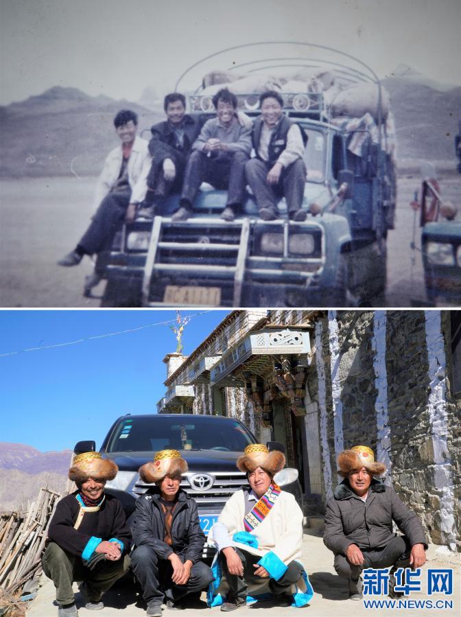 拼版照片:上圖:1994年,24歲的強(qiáng)巴(右二)和他的三個(gè)兄弟在西藏阿里地區(qū)跑運(yùn)輸時(shí),在自己購買的“東風(fēng)”牌運(yùn)輸車前合影(強(qiáng)巴提供)。(新華社發(fā))