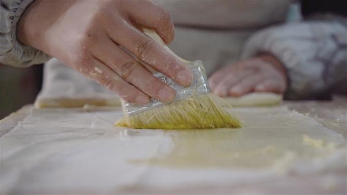 尼珍店內(nèi)共有7種類型的卡塞與布魯,她每天要工作到晚上9點半?!?月初,我們就開始制作售賣卡塞,今年生意還不錯,店員大部分是放假的大學(xué)生,每年這個時候,他們都會來店里工作?!蹦嵴湫Φ?。