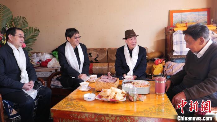 圖為旦科(右二)一行在策墨林·單增赤列(右一)家中慰問(wèn)?!≈x牧 攝