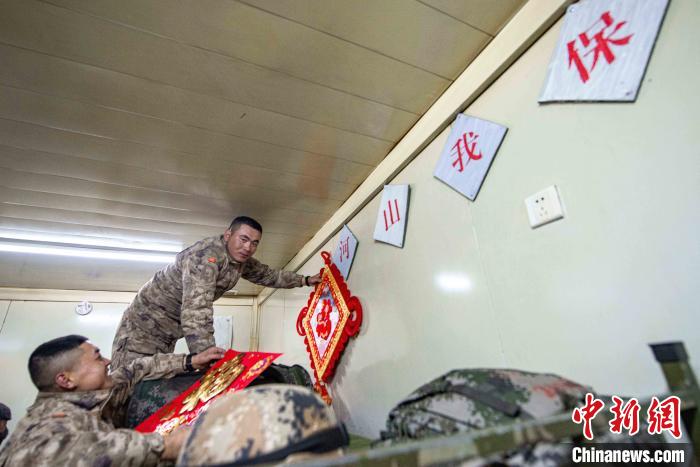 保溫方艙內,該旅官兵正在用“福”字精心點綴裝飾。 王述東 攝