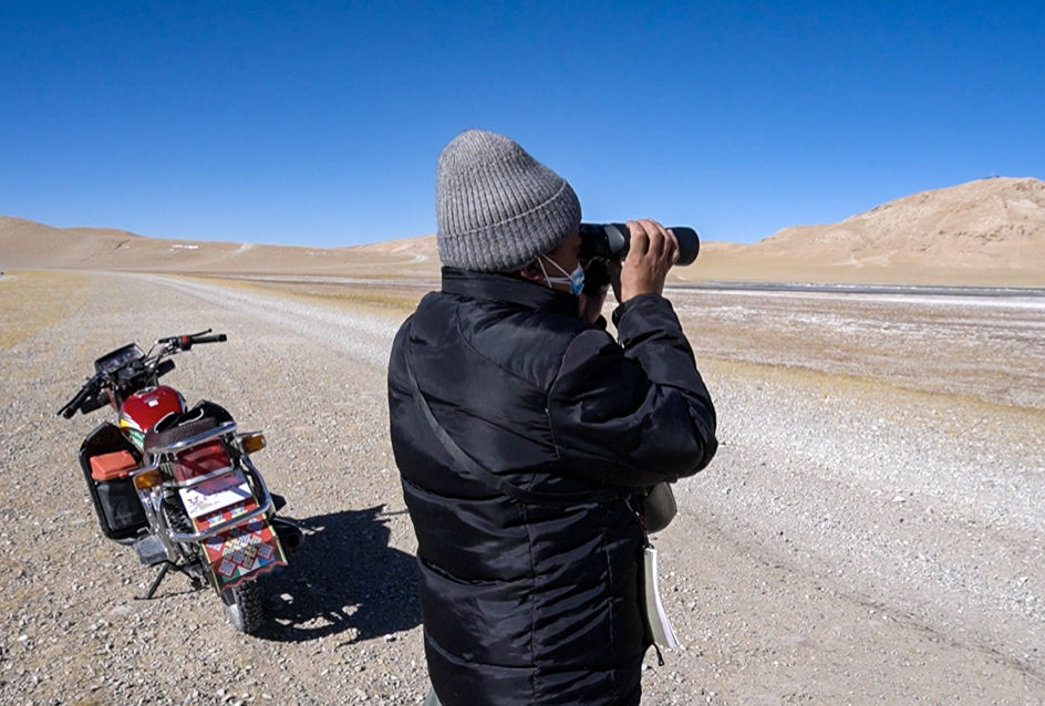 次成塔青拿著望遠鏡觀察遠方(2021年2月攝)。 新華社記者 田金文 攝