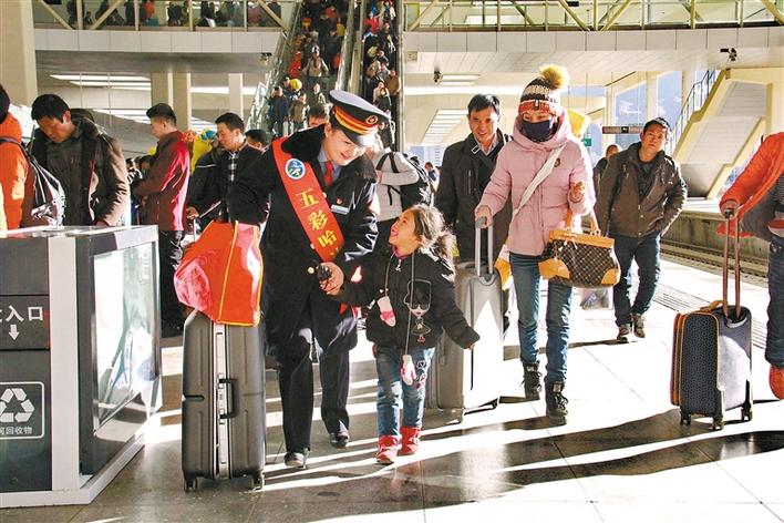 圖為拉薩市火車站工作人員幫助旅客進站