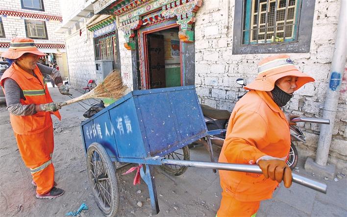 圖為拉薩市城關區(qū)環(huán)衛(wèi)工人在清掃街道