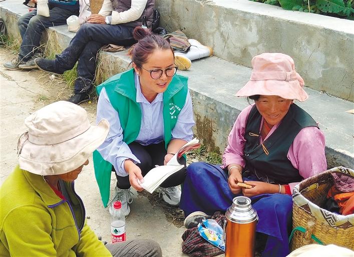 圖為山南市曲松縣駐村工作隊隊員(中)向老百姓宣講黨的優(yōu)惠政策