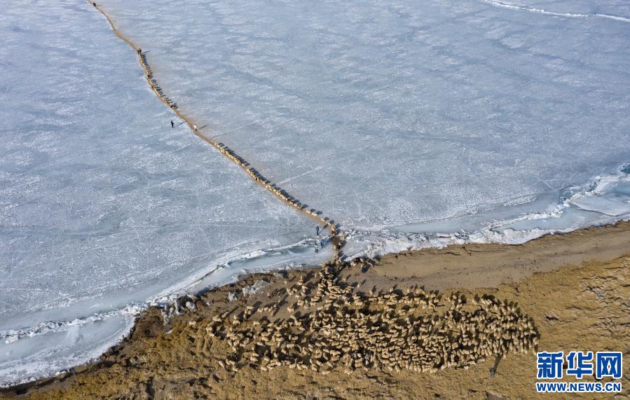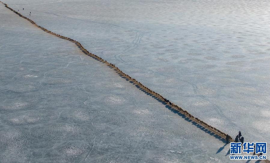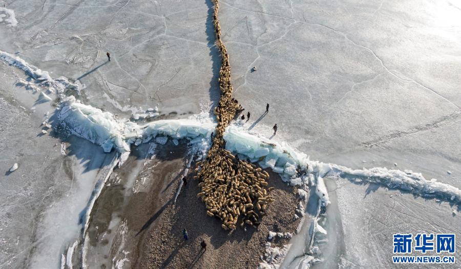 2000多只羊,在冰湖上如一條長長的線,緩緩前行……