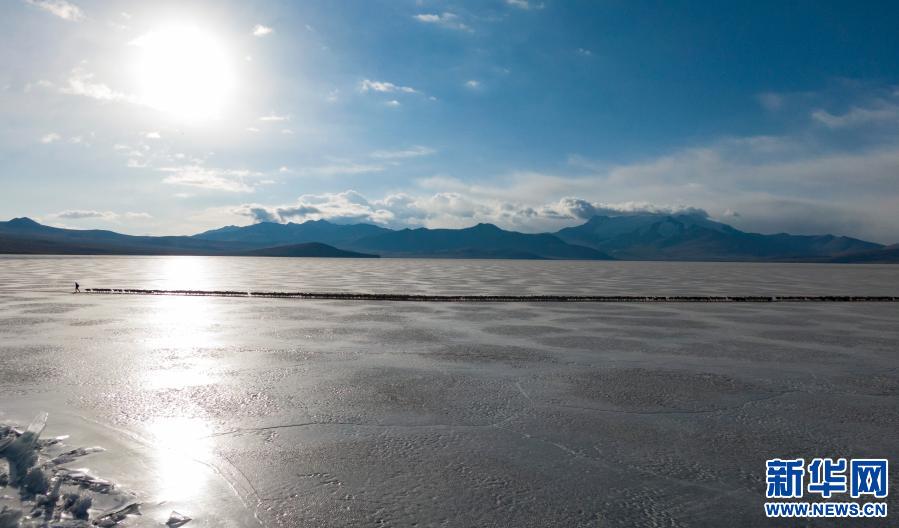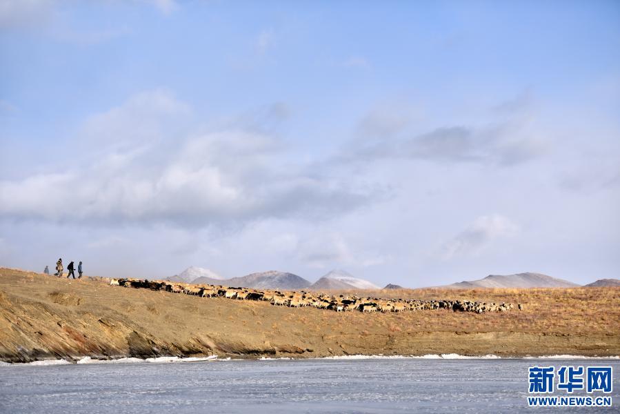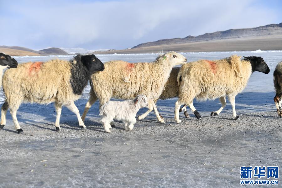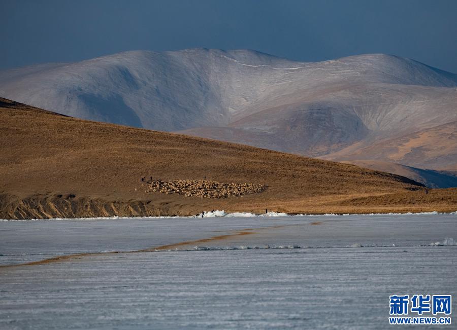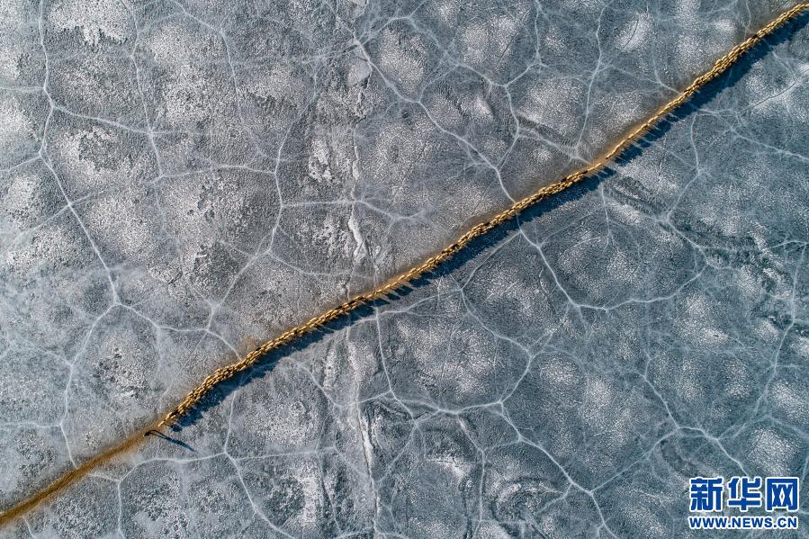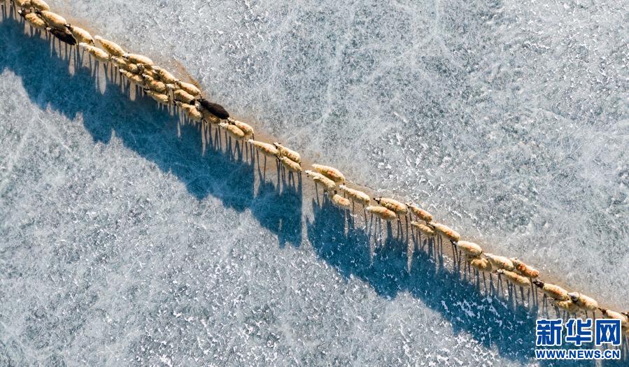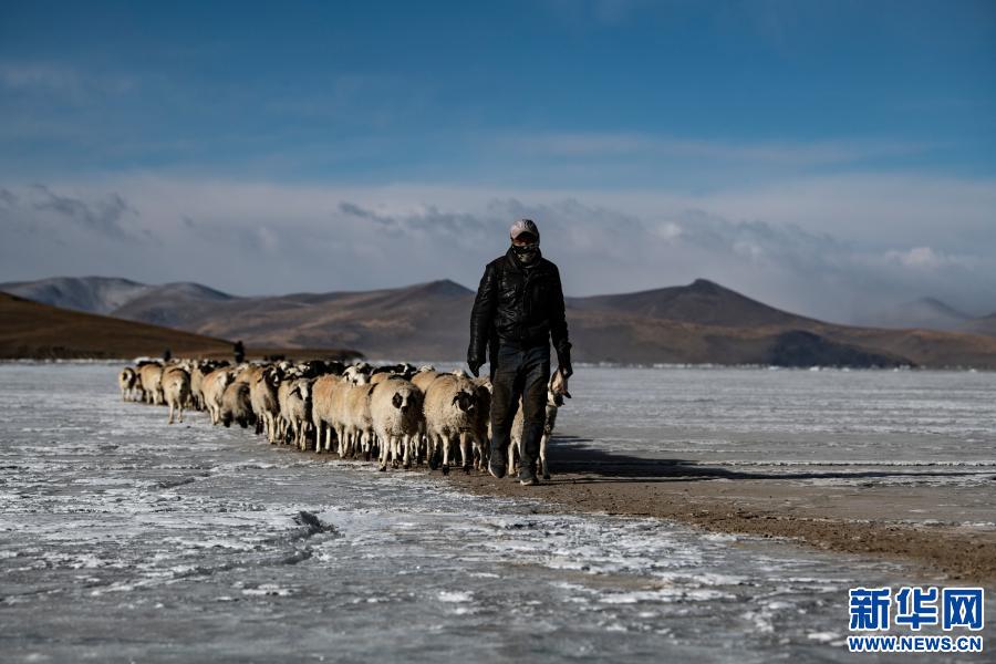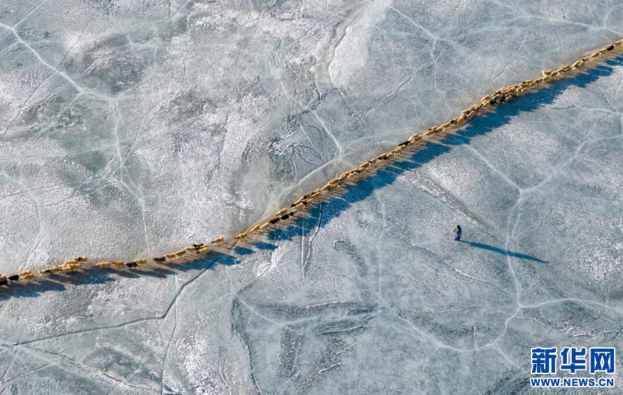 牧羊人趕著羊群,太陽趕著牧羊人。不停向前的羊群在冰湖上拉出長長的隊(duì)形。