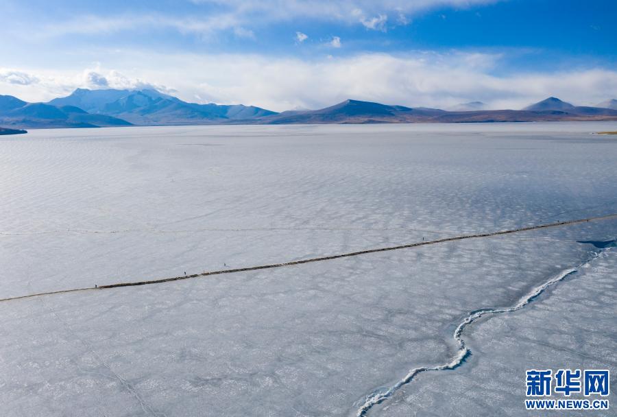 羊群順著安全小路通過普莫雍錯(cuò)冰湖(3月6日攝,無人機(jī)照片)。新華社記者 孫瑞博 攝