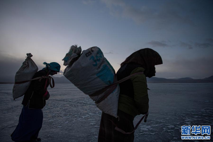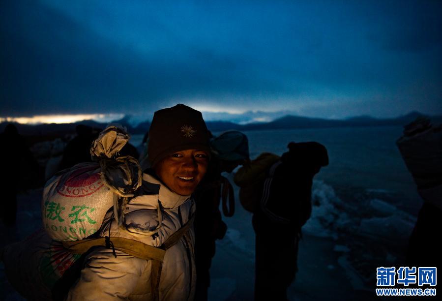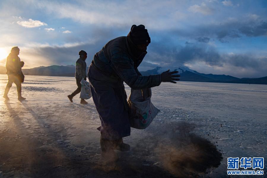 西藏山南市浪卡子縣堆瓦村的村民清晨背著牛糞爐灰來到普莫雍錯(cuò)湖邊,準(zhǔn)備修通安全小路(3月6日攝)。新華社記者 孫非 攝