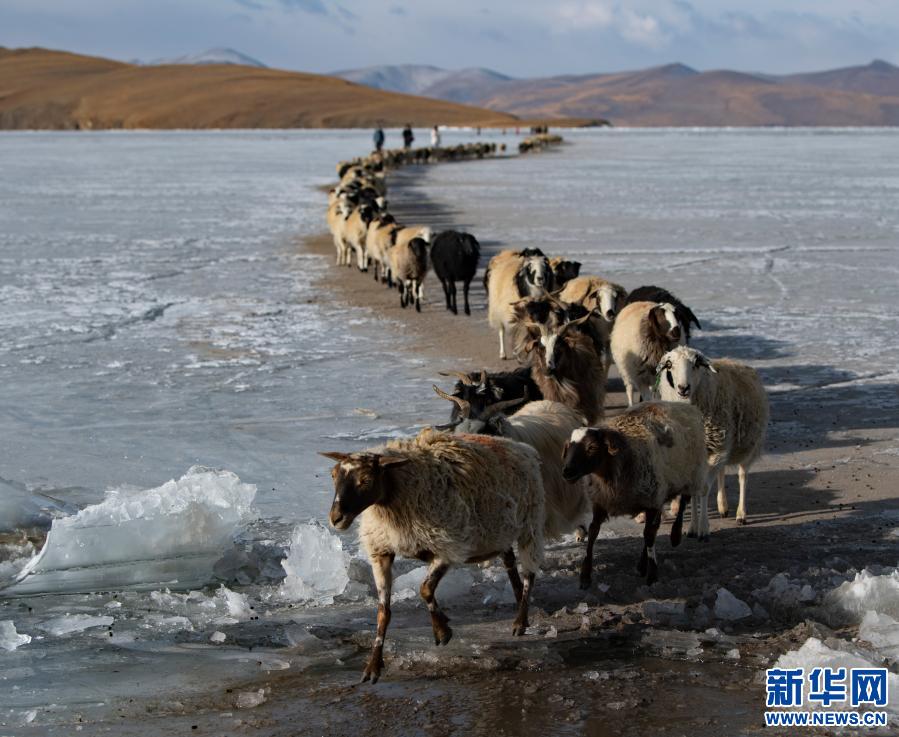 羊群順著安全小路通過普莫雍錯(cuò)冰湖(3月6日攝)。新華社記者 孫瑞博 攝