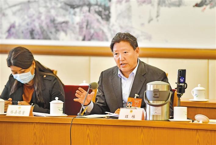 圖為全國人大代表旺堆在十三屆全國人大四次會(huì)議西藏代表團(tuán)全體會(huì)議上發(fā)言。記者 旦增西旦 攝