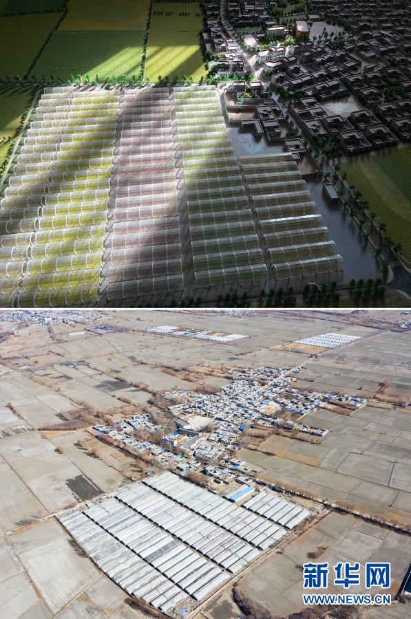 拼版照片的上圖是西藏山南市乃東區(qū)克松社區(qū)農(nóng)業(yè)產(chǎn)業(yè)生產(chǎn)基地規(guī)劃沙盤(2月9日攝);下圖是克松社區(qū)農(nóng)業(yè)產(chǎn)業(yè)生產(chǎn)基地(2月9日攝,無(wú)人機(jī)照片)。新華社記者 普布扎西 攝