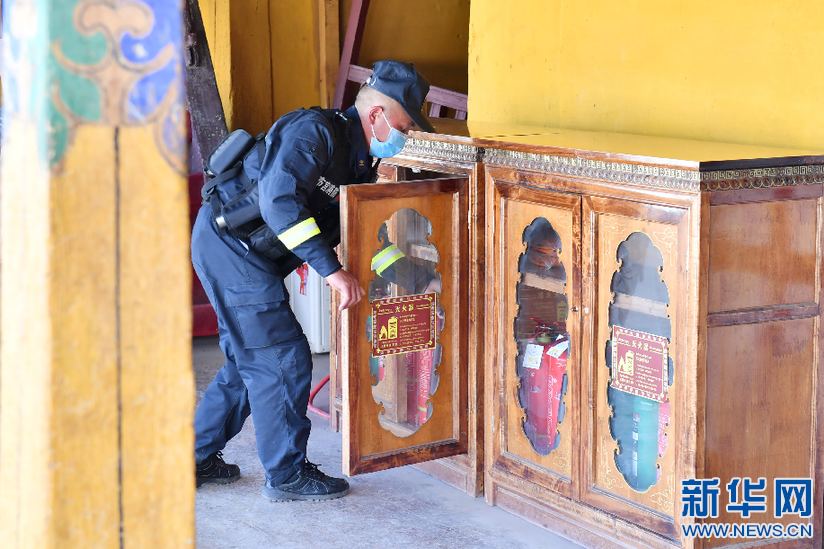 布達拉宮消防救援大隊隊員在巡邏期間檢查消防設施(3月4日攝)。新華社記者 孫瑞博 攝