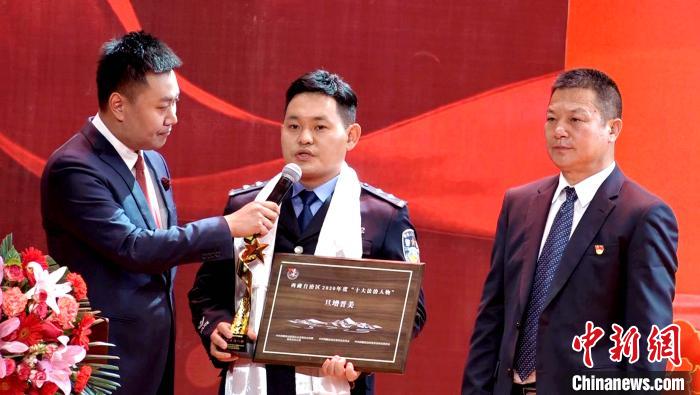 圖為日喀則市定日縣尼轄鄉(xiāng)孔美村第一書記尹傳奇上臺領獎。貢桑拉姆 攝