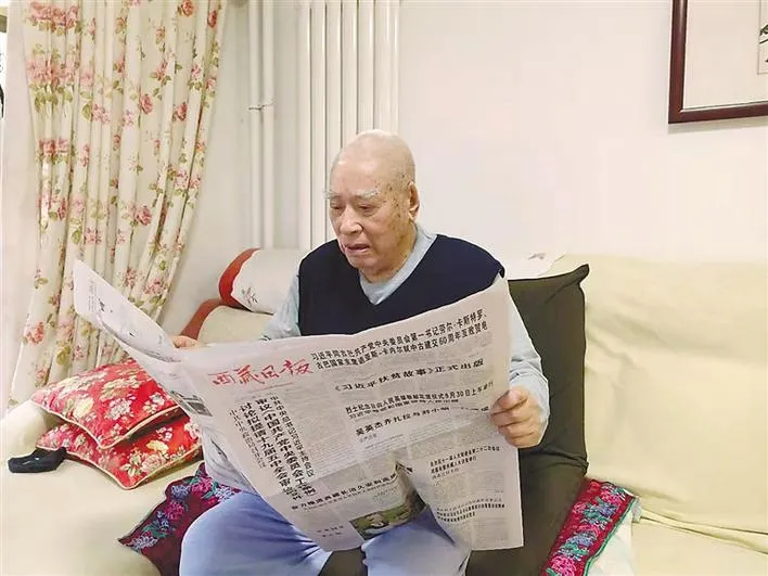 圖為開斗山在北京家中閱讀《西藏日報》