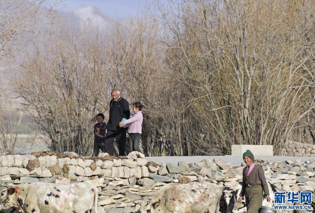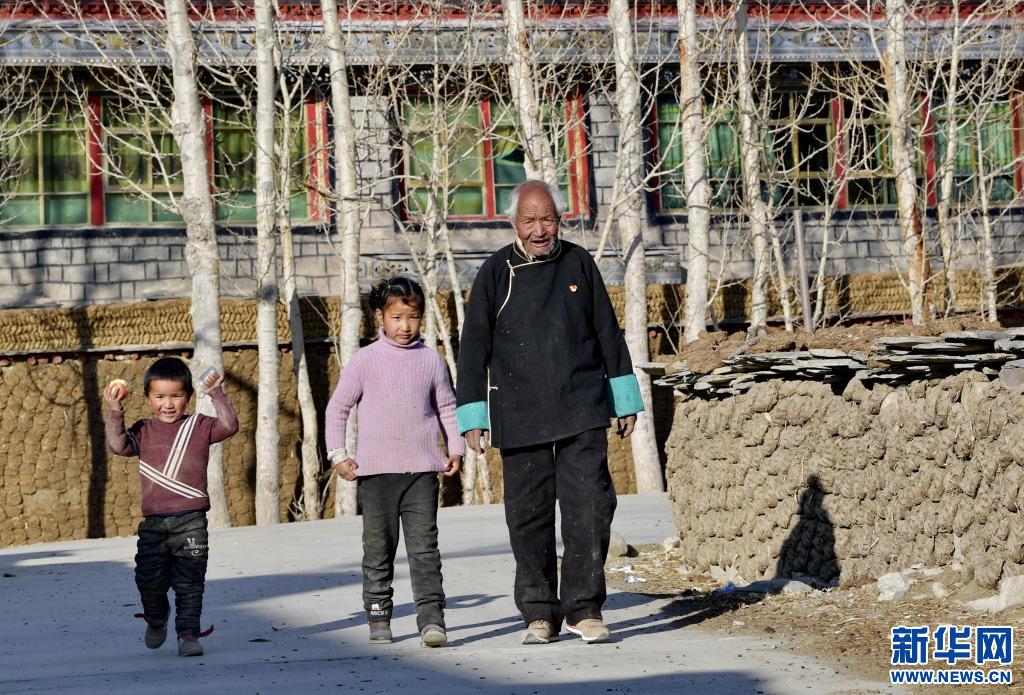 達(dá)國(guó)杰和孫子孫女在村子里散步(3月22日攝)。新華社記者 張汝鋒 攝