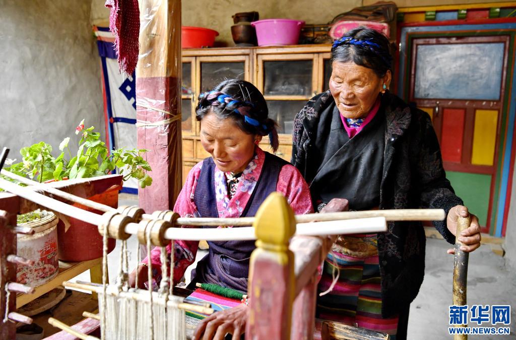 拉巴(右)指導(dǎo)女兒尼瑪倉木決織氆氌(3月20日攝)。新華社記者 張汝鋒 攝