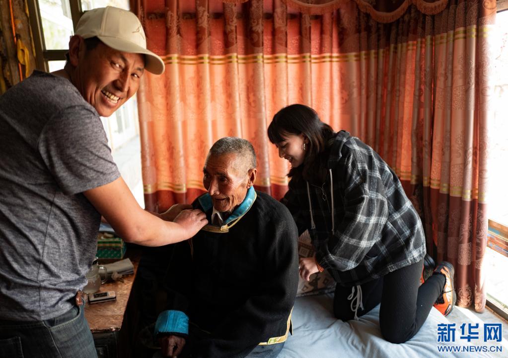 拉布老人的家人幫他整理藏裝(4月25日攝)。新華社記者 普布扎西 攝