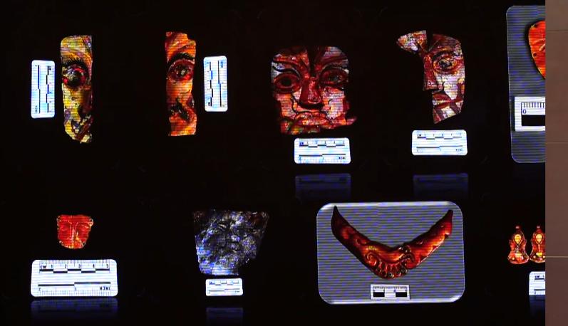 西藏自治區(qū)文物保護(hù)研究所副研究員、桑達(dá)隆果墓地考古發(fā)掘領(lǐng)隊(duì) 何偉:它們出土位置是臨近的,有彩繪的金銀面飾,它是敷于這個(gè)木俑的臉部的。