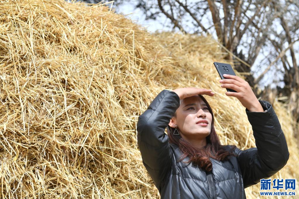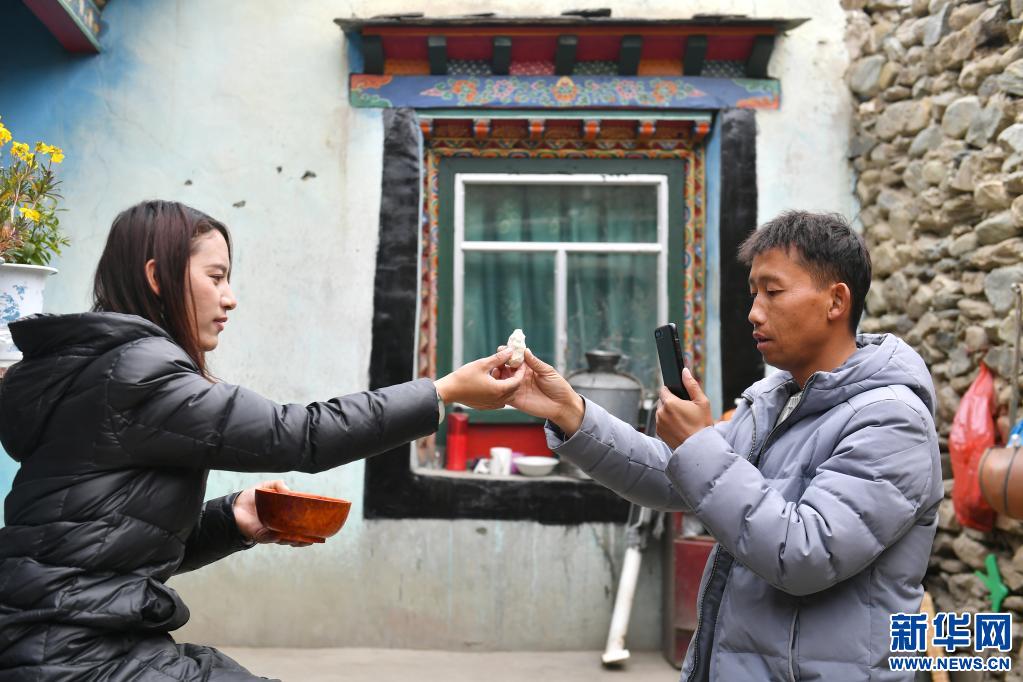 扎西拉姆(左)把剛?cè)嗪玫聂佤芜f給拍攝短視頻的丈夫田輝(4月2日攝)。新華社記者 孫瑞博 攝