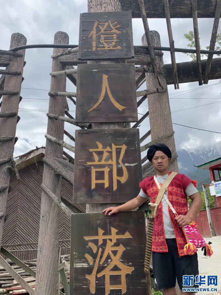 迪龍身著僜人傳統(tǒng)服飾站在村莊門(mén)口。 新華社發(fā)