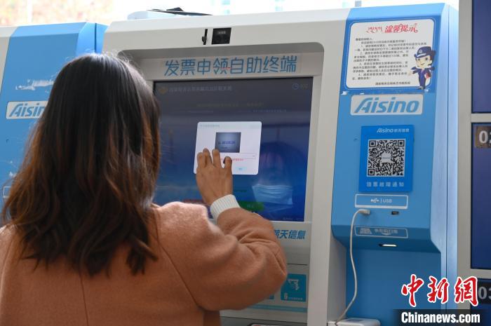 圖為一名企業(yè)財(cái)務(wù)人員通過發(fā)票申領(lǐng)自助終端申領(lǐng)發(fā)票。