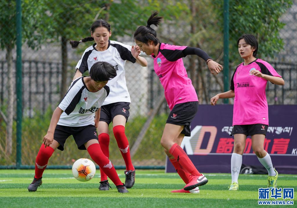 在拉薩首次舉辦的民間女子足球比賽——“亞克杯”女子足球賽上,雪域女足隊隊員次卓瑪(白)試圖突破另類女足隊(粉)的防線(2020年7月23日攝)。新華社記者晉美多吉 攝