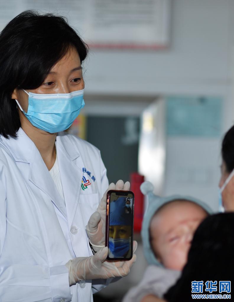 6月1日,在拉薩市人民醫(yī)院,來自北京的兒科專家(左)幫助一名家長(zhǎng)與在北京的兒科專家視頻連線。新華社記者 覺果 攝