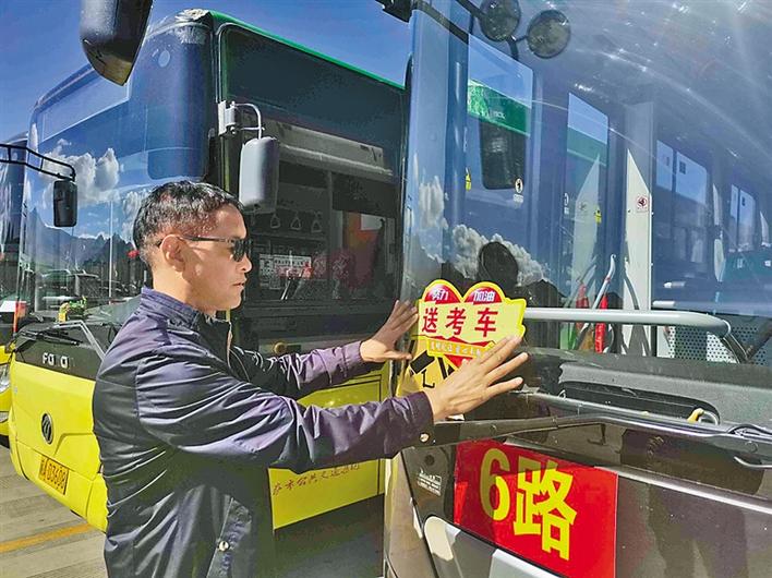圖為公交車工作人員在粘貼愛心送考車標(biāo)志。記者 次吉 攝