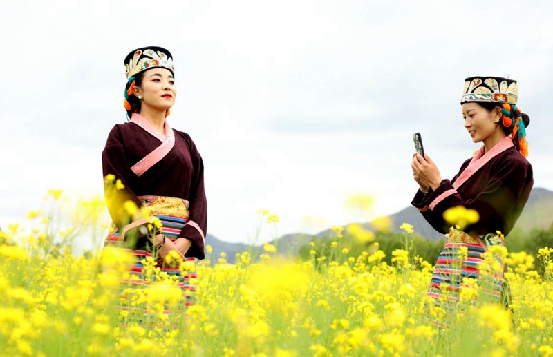 身著節(jié)日盛裝在花海中拍照。格桑倫珠攝