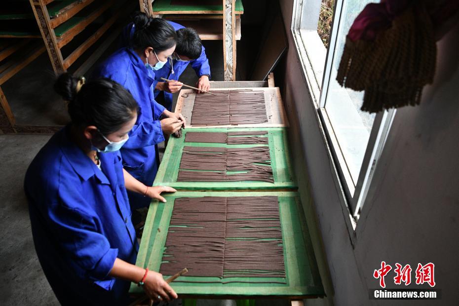 7月22日,西藏自治區(qū)林芝市察隅縣塔林村“察隅旺扎藏香”生產合作社的工人用紗網接藏香。2014年,“察隅旺扎藏香”生產合作社成立,生產主要由白檀香和紫檀香、沉香、丁香等30多種純天然珍貴藥材及香料制成的藏香,目前年收益可達十余萬元人民幣。合作社不僅帶動了當地人員就業(yè),也推動藏香經濟進一步發(fā)展,促進農牧民增收。 中新社記者 李嘉嫻 攝