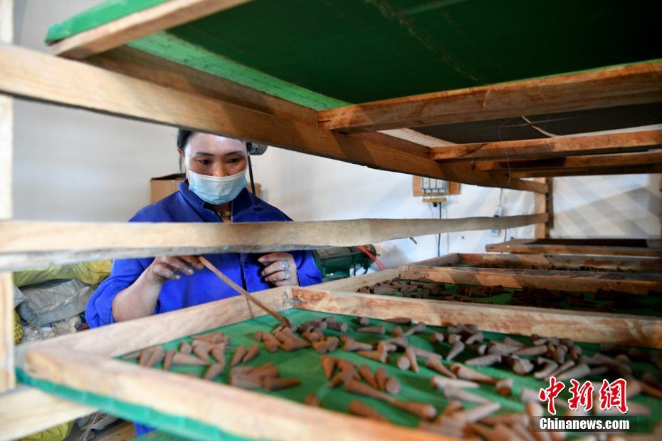 7月22日,西藏自治區(qū)林芝市察隅縣塔林村“察隅旺扎藏香”生產合作社的工人檢查風干的藏香。2014年,“察隅旺扎藏香”生產合作社成立,生產主要由白檀香和紫檀香、沉香、丁香等30多種純天然珍貴藥材及香料制成的藏香,目前年收益可達十余萬元人民幣。合作社不僅帶動了當地人員就業(yè),也推動藏香經濟進一步發(fā)展,促進農牧民增收。 中新社記者 李嘉嫻 攝