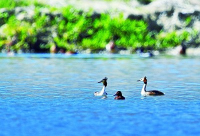 幾只水鳥(niǎo)在西藏拉薩的拉魯濕地嬉戲。新華社發(fā)