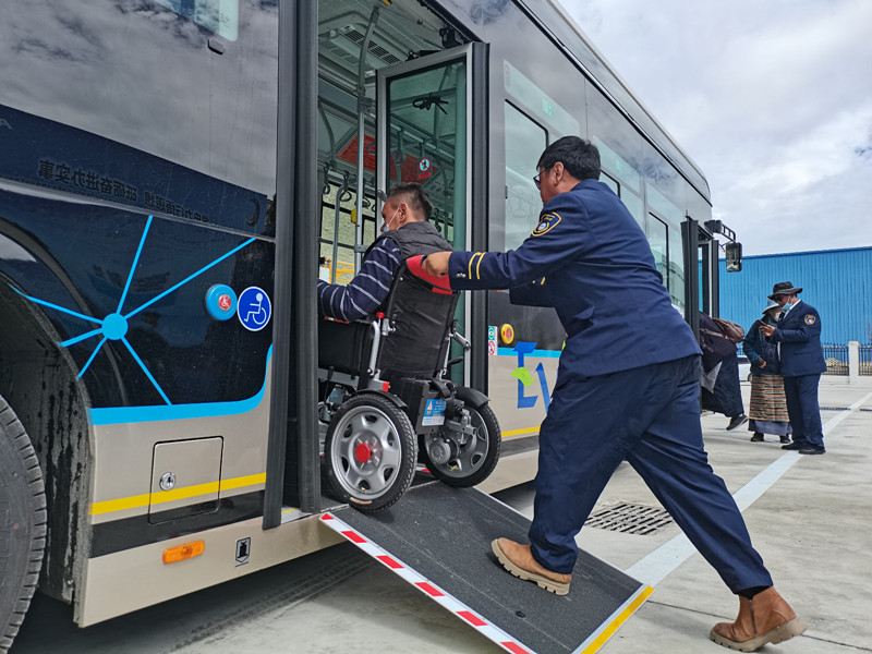 3日,拉薩市公交運營有限公司舉行拉薩公交經(jīng)開區(qū)B區(qū)公交首末站啟用暨大站快線開通儀式。現(xiàn)場,坐在輪椅上的市民覺列準(zhǔn)備乘坐新公交車,駕駛員接到乘車提示后,采取制動措施,將車輛熄火后來到后門處,將無障礙踏板翻開并固定好,順利幫其上車。