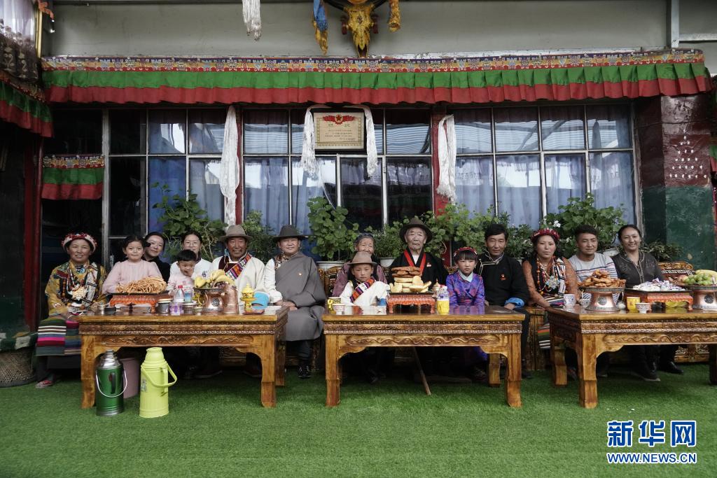西藏日喀則市桑珠孜區(qū)東嘎鄉(xiāng)加吾崗村退役老兵平措(右六)與家人合影(7月27日攝)。新華社記者 黃康懿 攝