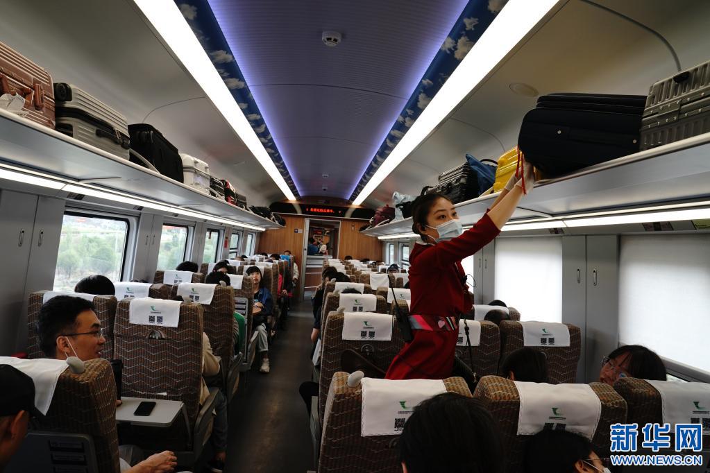 拉林鐵路復(fù)興號列車乘務(wù)員正在為旅客整理行李(2021年7月8日攝)。新華社記者 劉洪明 攝