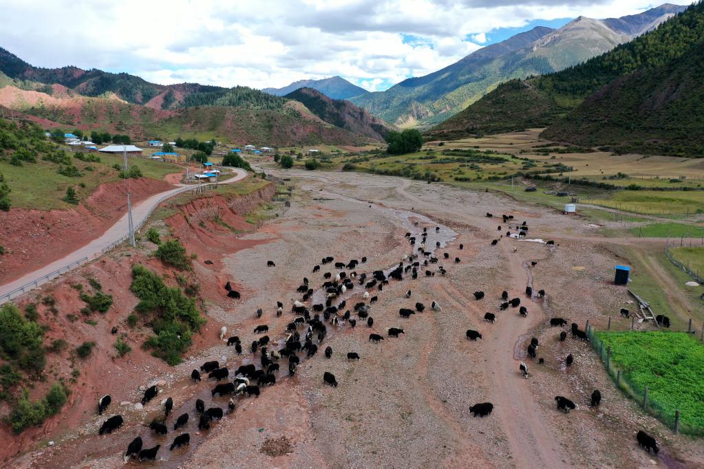 昌都市類烏齊縣賓達(dá)鄉(xiāng)央宗村央宗牦牛育肥基地的牦牛(2020年9月21日攝,無人機照片)。新華社記者 詹彥 攝