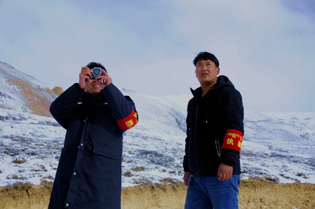 楚魯松杰鄉(xiāng)干部群眾在牧場(chǎng)例行巡邏(2019年1月8日攝)。 新華社記者陳尚才 攝