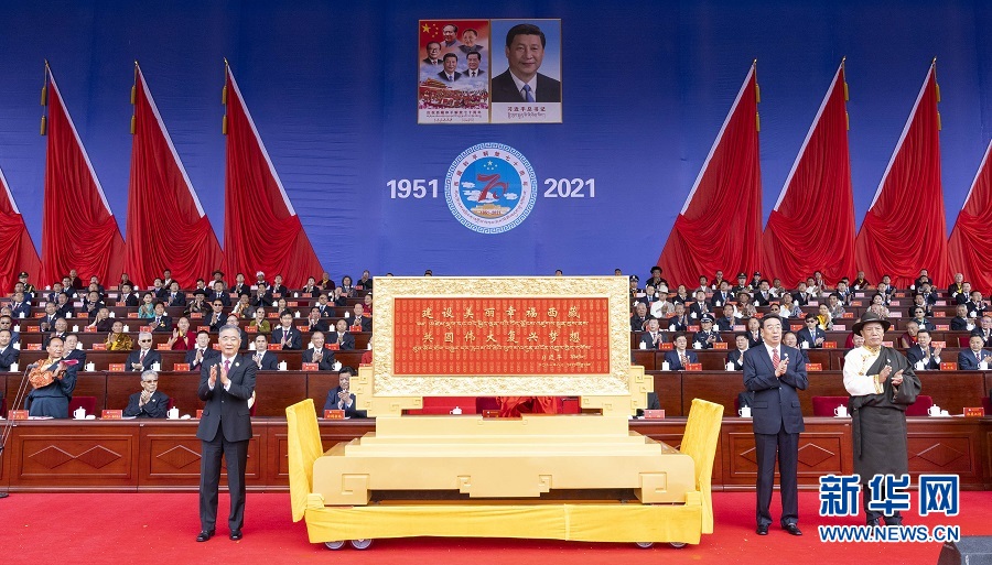 8月19日,慶祝西藏和平解放70周年大會在拉薩隆重舉行。中共中央政治局常委、全國政協(xié)主席、中央代表團團長汪洋向西藏自治區(qū)、西藏軍區(qū)、武警西藏總隊、西藏自治區(qū)政法系統(tǒng)、中國佛協(xié)西藏分會分別贈送了中共中央總書記、國家主席、中央軍委主席習(xí)近平題詞的“建設(shè)美麗幸福西藏 共圓偉大復(fù)興夢想”賀匾和賀幛。新華社記者 黃敬文 攝