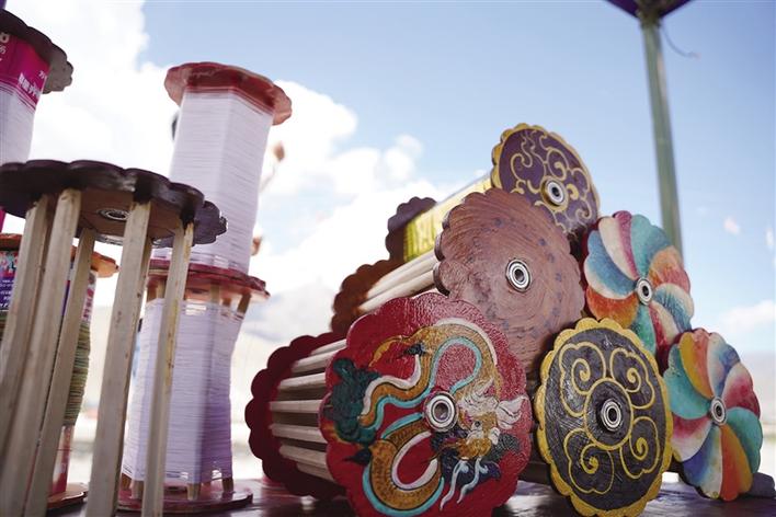 從傳統(tǒng)的制作工藝來講,藏式風箏由風箏的主體、細線、輪軸線三大部分組成。風箏主體都是左右長、上下短的菱形,中軸上一根細竹緊貼在紙面上撐起上下,然后橫上一根弓形細竹支撐左右兩邊,風箏上大多提前繪制好了圖案。雖然制作工藝看似簡單,但是竹子的粗細、長短,紙張的裁剪都有其中的門道,如果把握不好的話,即便是制作出來了,也可能飛不起來。