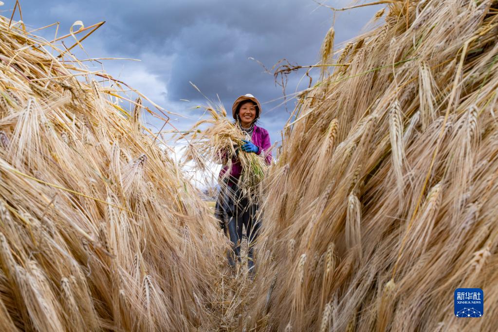 9月23日,西藏那曲市尼瑪縣文部鄉(xiāng)文部南村村民開鐮收割。新華社記者 普布扎西 攝