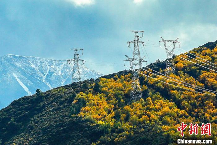 圖為雪山、秋色與藏中電力聯(lián)網(wǎng)工程的電塔。國(guó)網(wǎng)西藏電力有限公司 供圖