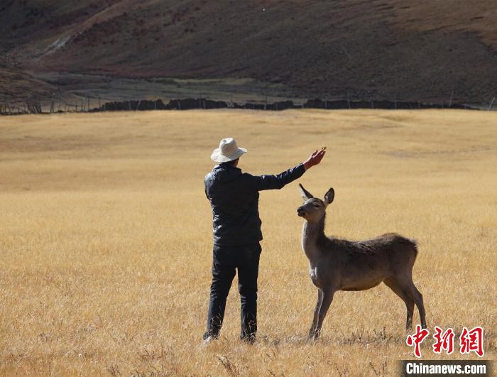 圖為西藏類烏齊馬鹿國(guó)家級(jí)自然保護(hù)區(qū)的管護(hù)員正在飼喂馬鹿。冉文娟 攝