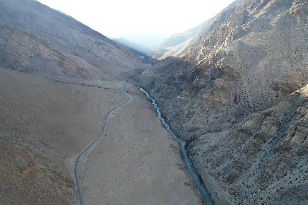 離開(kāi)參木達(dá)村,沿扎嘎曲逆流而上行駛約20分鐘后,公路旁的扎嘎曲開(kāi)始在峽谷中東西向蜿蜒而行,進(jìn)入整條河流的最狹窄處。記者在S516省道29公里處停車(chē)航拍,只見(jiàn)公路與河流像兩條平行的曲線,時(shí)遠(yuǎn)時(shí)近,向遠(yuǎn)方延伸。