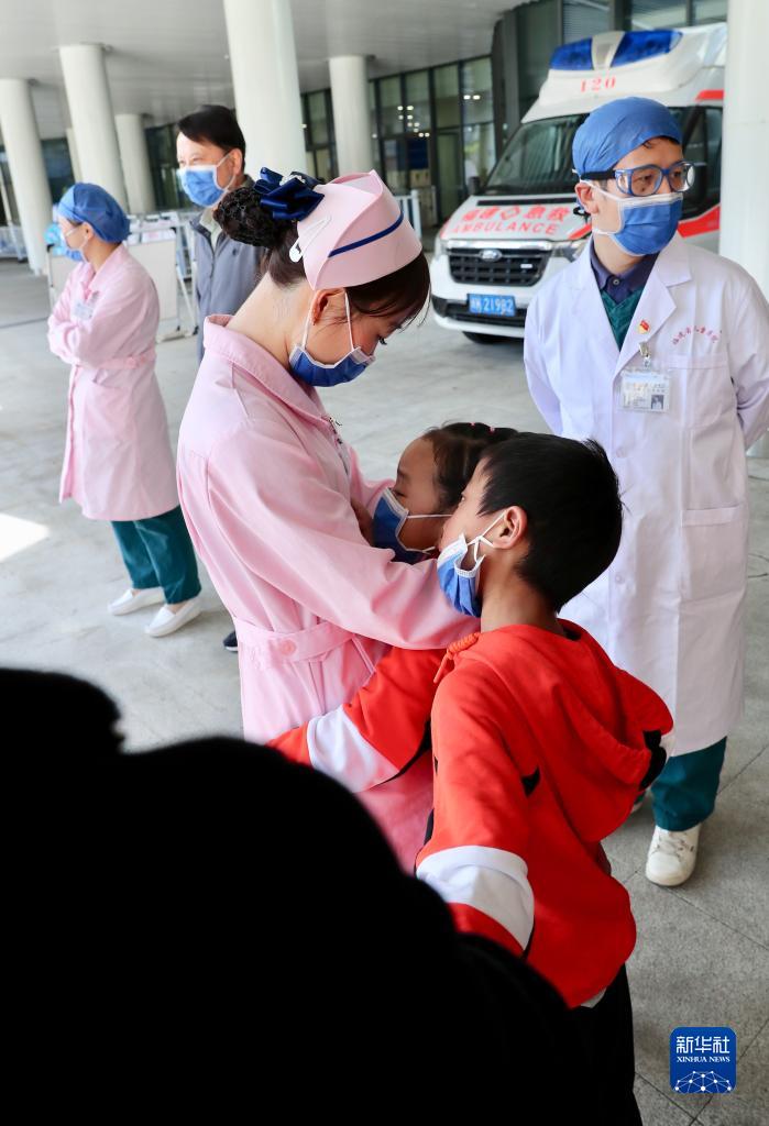 12月1日,在福建省兒童醫(yī)院,康復(fù)出院的先心病患兒在上車前與照顧自己多日的醫(yī)務(wù)人員告別。新華社記者 姜克紅 攝