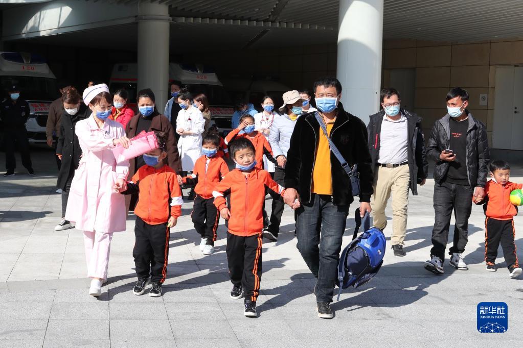 12月1日,康復(fù)出院的先心病患兒與家人在醫(yī)院工作人員的陪伴下走出福建省兒童醫(yī)院大樓。新華社記者 姜克紅 攝