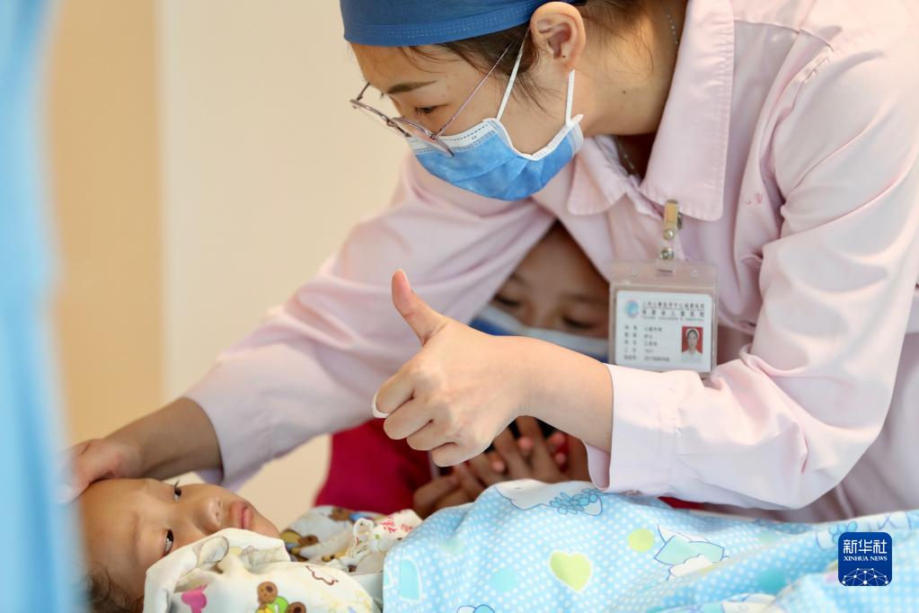 11月25日,在福建省兒童醫(yī)院病房,護(hù)士向康復(fù)中的先心病患兒索朗次珍表示鼓勵。新華社記者 姜克紅 攝